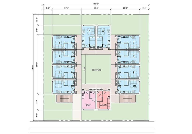 20 units of modular studio ImHomeTooâ„¢ living units stacked two high, interconnected and supported by a laundry and staff office.