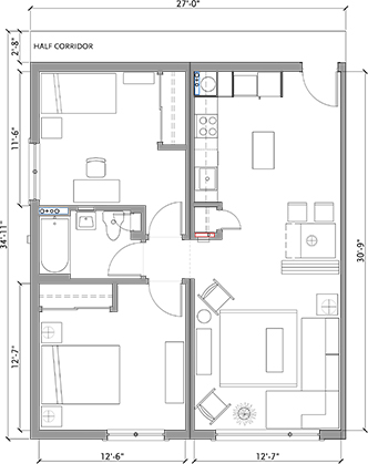 The Kah San Two is an 835 SF unit that can be coupled and stacked with other units. The spacious living area has a kitchen on one end and room for a dining table. Bedrooms are well-sized, carpeted and have large windows and closets. Mini split heat pumps can be added to maximize energy efficiency. The Kah San Two can be used for affordable or market-rate housing.