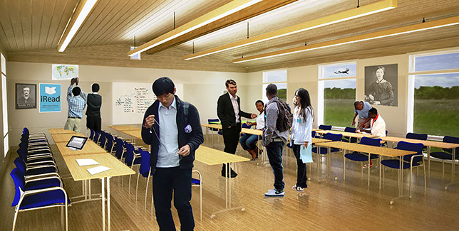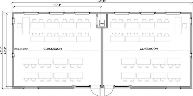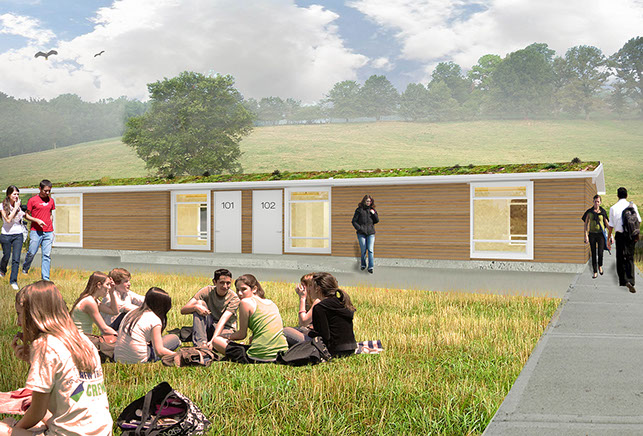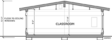GreenClass_1 has large windows and high ceilings to help make an optimal learning environment. Natural light, good ventilation, good acoustics, and flexibility are primary features of this classroom. The classrooms are two classrooms in two modules and are designed to stand alone on a school campus. GreenClass_1 exteriors will fit many types of campus designs and are built for durability.