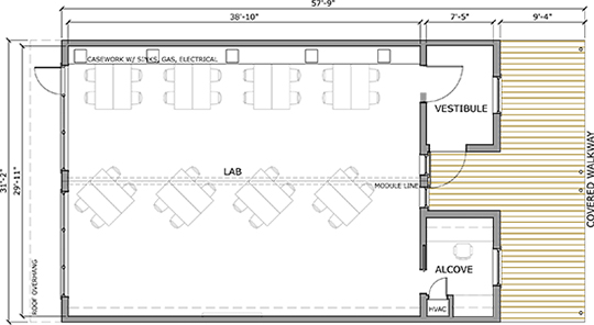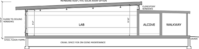 GreenLab_2 is designed to give enough space for chemistry, physics, biology, engineering and many other types of labs. GreenLab_2 is designed for maximum flexibility. A wet wall on one side has a full bank of upper and lower cabinets for lab supplies. It has a lab counter with five sinks and electrical and gas outlets.