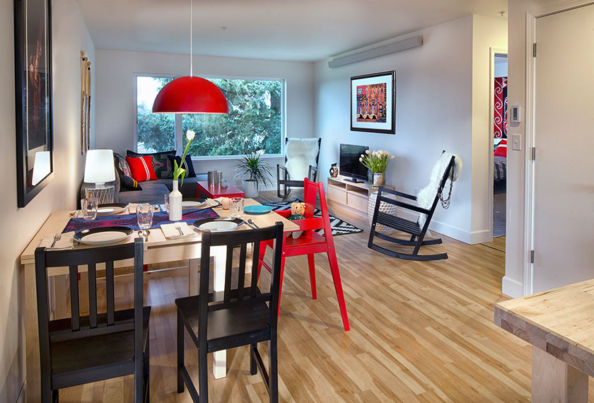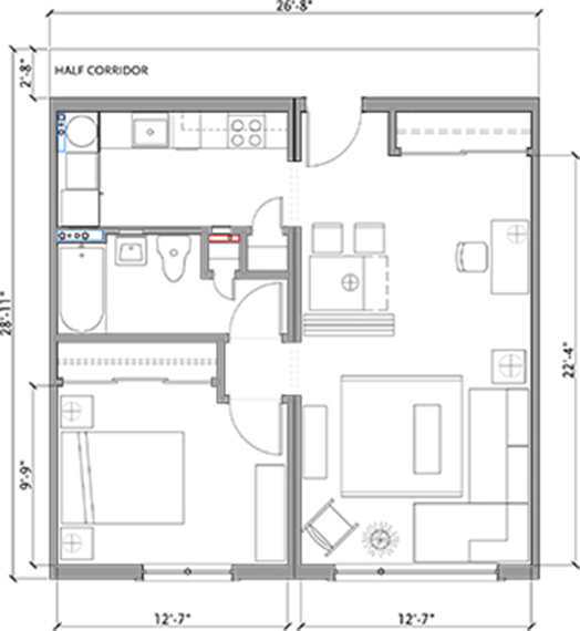 The Kah San One is is a modular 675 SF unit made up of two modules joined in the middle. The one bedroom apartment is designed for singles, couples, and small families. The spacious living area has a Kitchen off to the side and room for a dining table. The Bedroom is well-sized, carpeted and has large windows and a large closet. A mini split heat pump can be added to maximize energy efficiency.