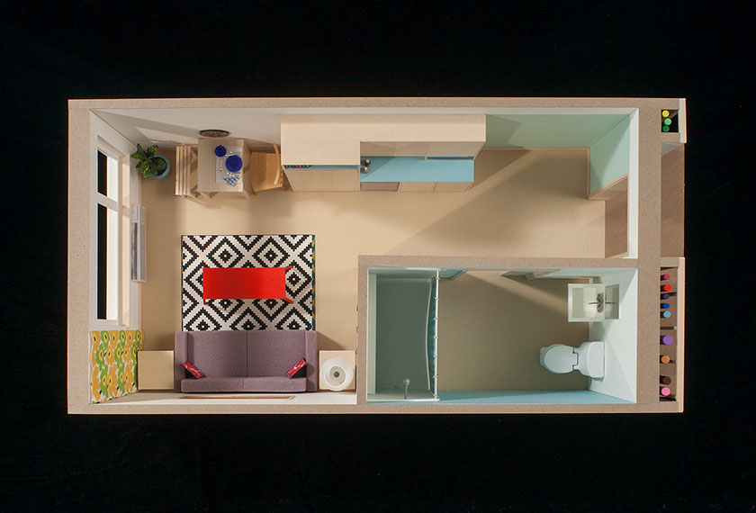 20 units of modular studio ImHomeTooâ„¢ living units stacked two high, interconnected and supported by a laundry and staff office.