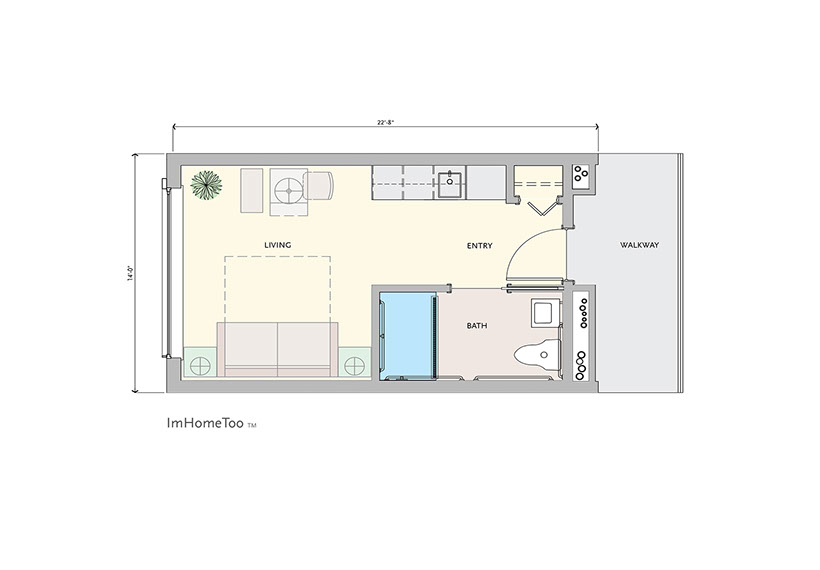 The 265 SF ImHomeToo studios have full baths and kitchenettes and are fully accessible. This project is designed as a prototype for subsequent projects of same and larger scale.